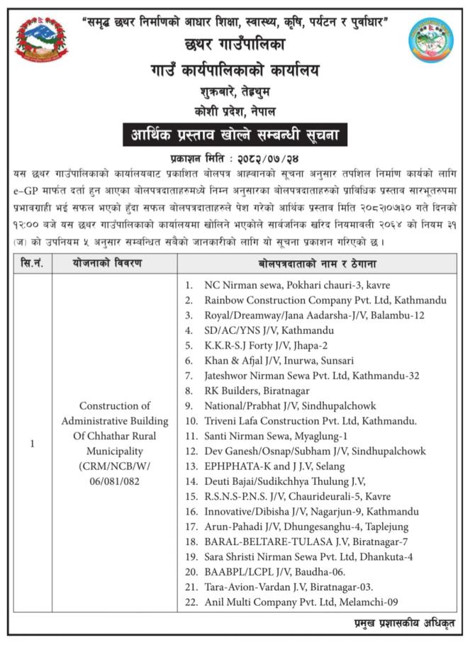 » आर्थिक प्रस्ताव खोल्ने सम्बन्धि सूचना ।