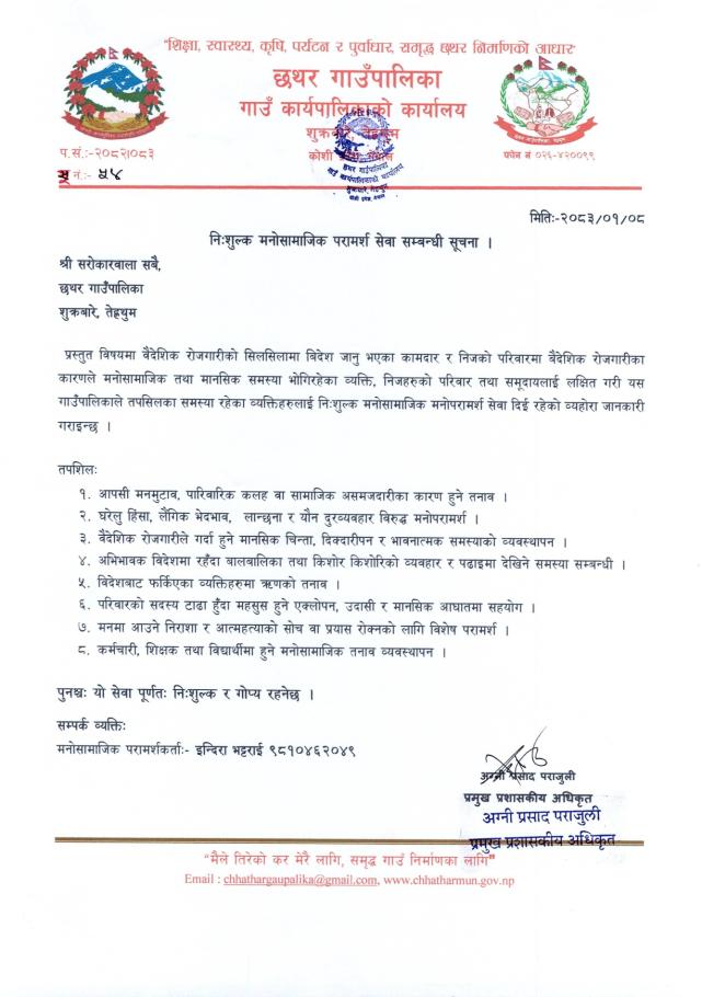 » निःशुल्क मनोसामाजिक परामर्श सेवा सम्बन्धी सूचना ।