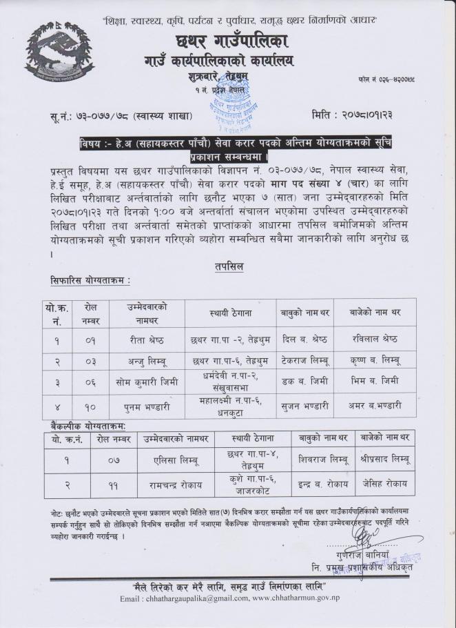 स्वास्थ्य सेवा करार पदको अन्तिम योग्यताक्रमको सूचि प्रकाशन सम्बन्धमा